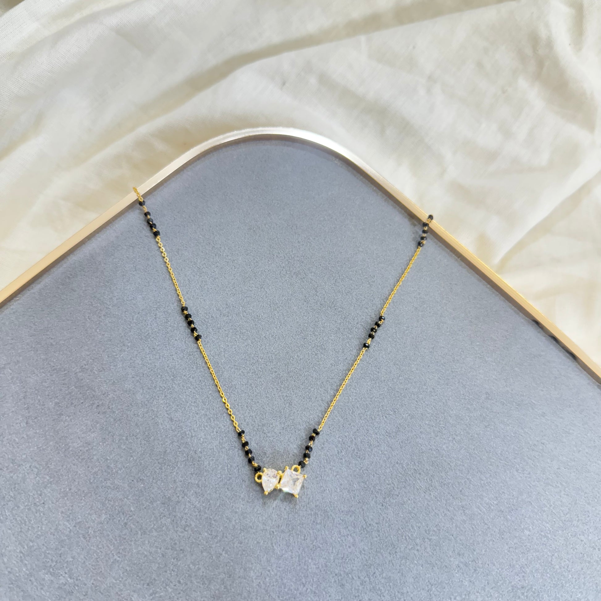 Presenting our contemporary Anvi Mangalsutra, where tradition meets modern elegance. Featuring minimal black beads and a sleek, unique pendant, this gold-colored masterpiece offers the perfect blend of sophistication and style. Ideal for weddings or adding a stylish touch to any outfit, this Mangalsutra seamlessly merges heritage with a contemporary twist.